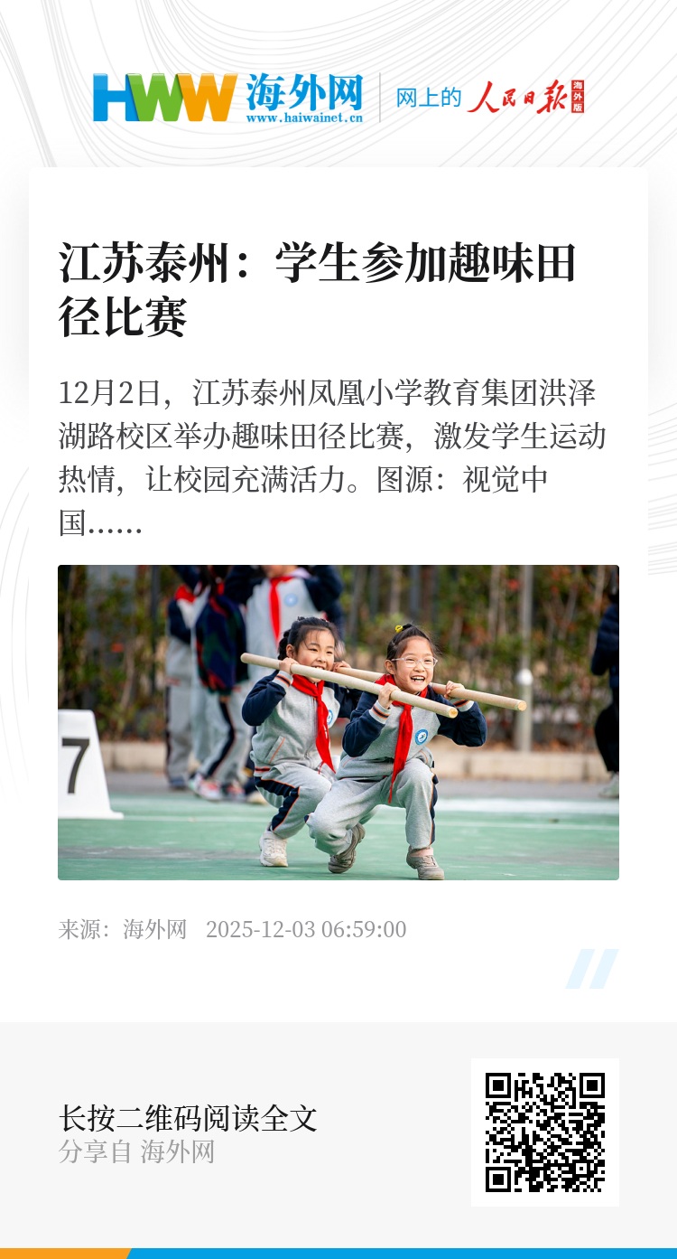12月2日,江苏泰州凤凰小学教育集团洪泽湖路校区举办趣味田径比赛,激发学生运动热情,让校园充满活力。图源:视觉中国