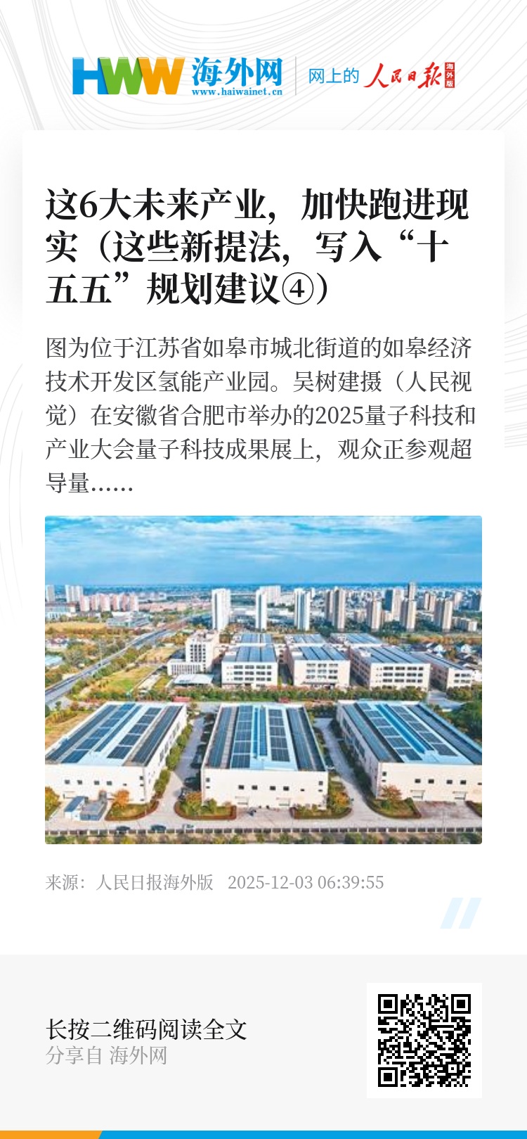 未来产业是中国“三新”(新产业、新业态、新商业模式)经济的重要一环。去年,中国“三新”经济增加值占GDP比重已超过18%。“十五五”规划建议提出“前瞻布局未来产业”,“推动量子科技、生物制造、氢能和核聚变能、脑机接口、具身智能、第六代移动通信等成为新的经济增长点”。