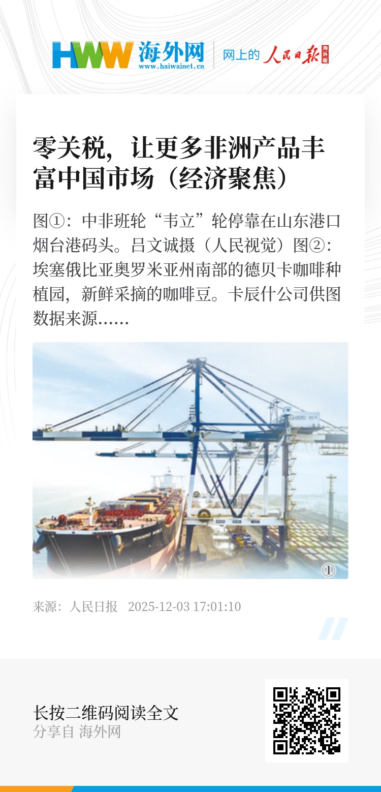 “零关税使我们的咖啡在中国市场极具竞争力。”埃塞俄比亚最大的咖啡生产和出口企业卡辰什公司执行总裁伊思拉尔·德格表示,自2024年12月以来,公司咖啡产品对中国出口额大幅增加。零关税政策提升了埃塞俄比亚咖啡的价格竞争力,助力当地咖啡种植户、相关从业者增收致富。“我们计划进一步提高产量,以满足中国市场的更大需求。”伊思拉尔·德格说。