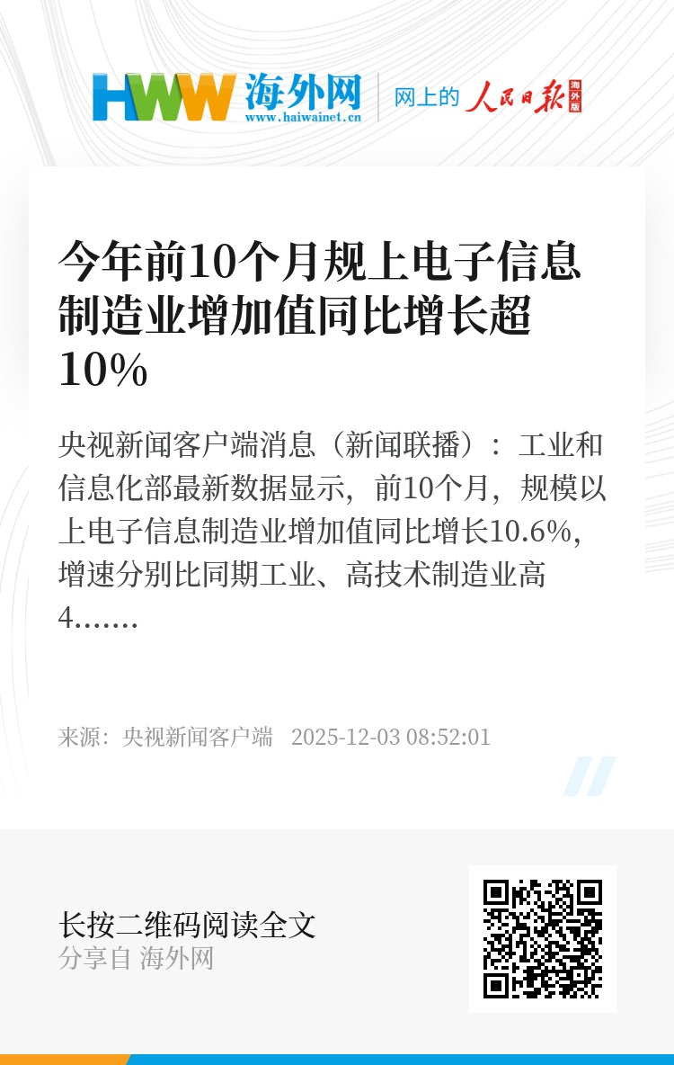 央视新闻客户端消息(新闻联播):工业和信息化部最新数据显示,前10个月,规模以上电子信息制造业增加值同比增长10.6%,增速分别比同期工业、高技术制造业高4.5个和1.3个百分点,展现出较强的产业韧性与发展活力。
