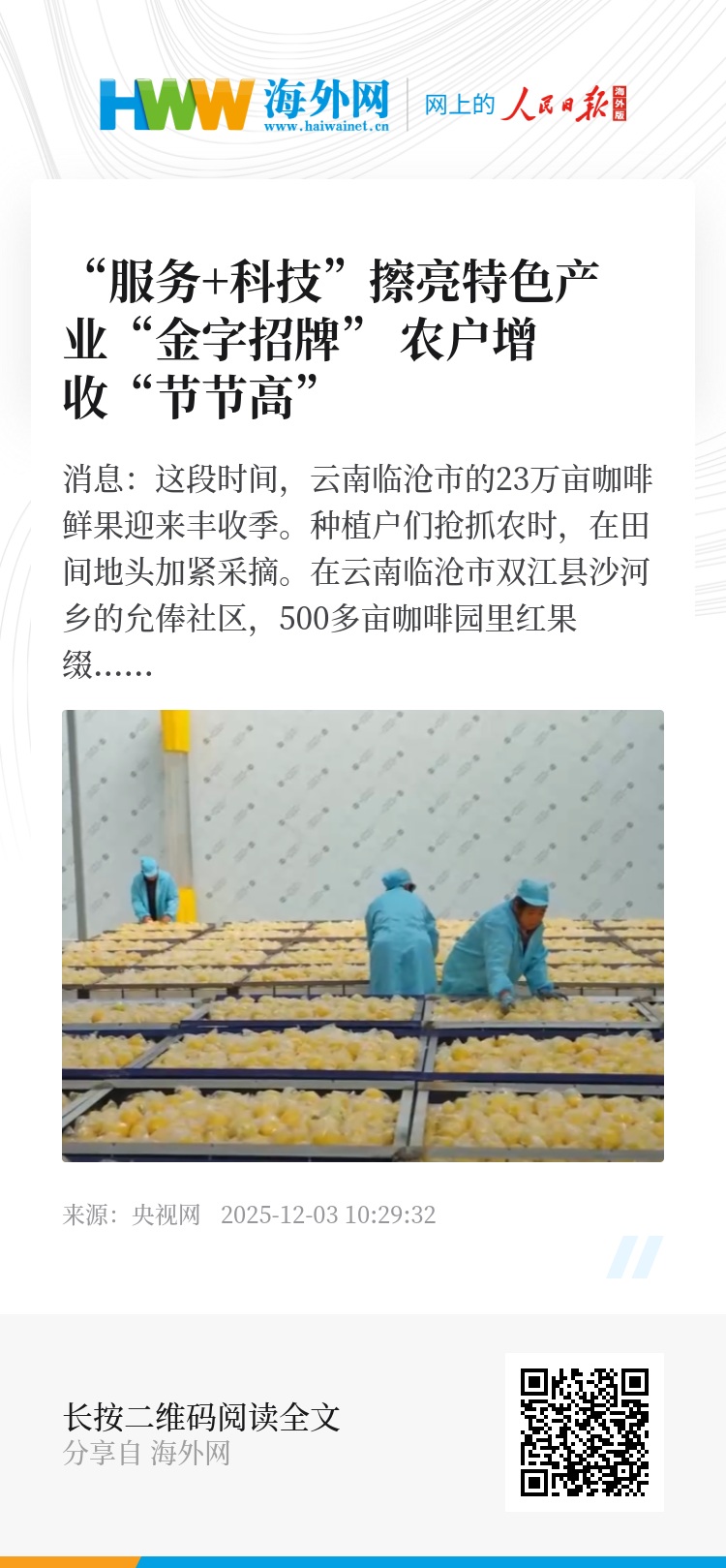 2025年,咖啡鲜果的收购价从2024年每公斤8元涨至9.6元,这得益于的精细化采摘。村里专门组织咖农开展分批采摘培训,先清摘病果虫果,再精选精品咖啡果。