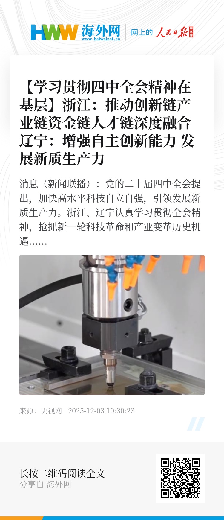 央视网消息(新闻联播):党的二十届四中全会提出,加快高水平科技自立自强,引领发展新质生产力。浙江、辽宁认真学习贯彻全会精神,抢抓新一轮科技革命和产业变革历史机遇,推动教育科技人才一体改革发展,增强自主创新能力。