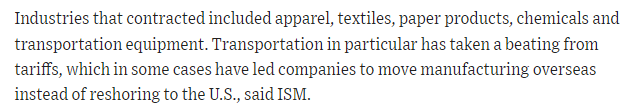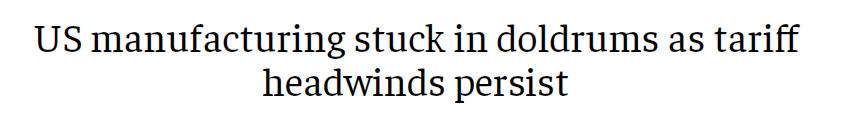 文章指出,美国制造业活动萎缩的行业主要包括服装、纺织品、纸制品、化工产品和运输业。文章表示,虽然当前美国工厂产量有所增加,但未售出的库存却急剧增加。需求增长放缓,这在出口市场体现尤为明显,而受关税影响,出口市场的前景更加暗淡。