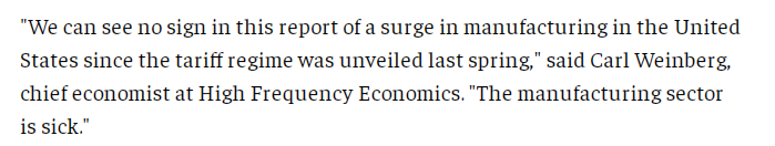 文章指出,美国政府的关税政策增加了原材料采购成本,继续给美国生产商带来压力。文章援引美国供应管理协会下属的制造业企业调查委员会主席苏珊·斯彭斯(Susan Spence)的话说,“完全是因为关税,我们看不到任何能够扭转(美国制造业)局面的迹象。”
