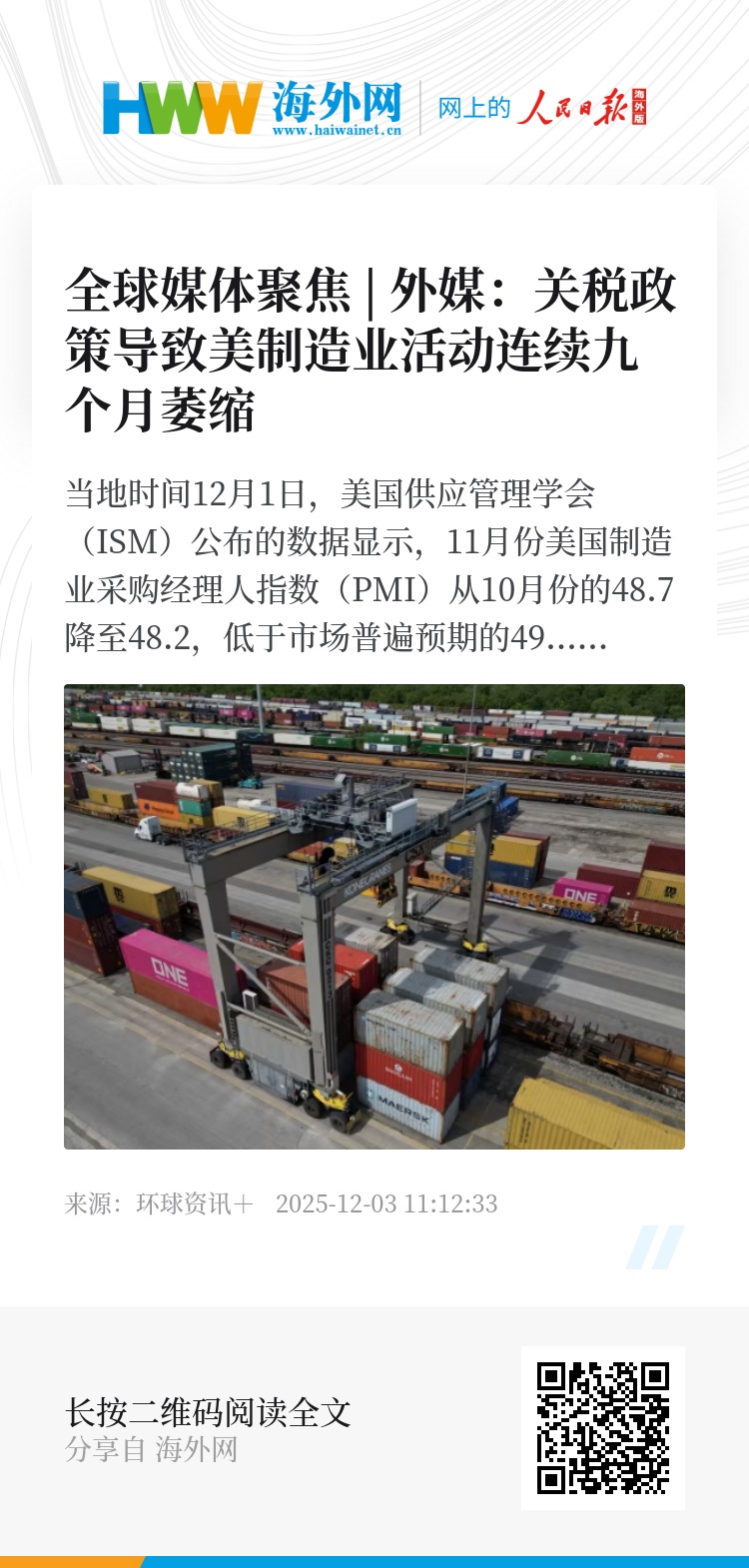 当地时间12月1日,美国供应管理学会(ISM)公布的数据显示,11月份美国制造业采购经理人指数(PMI)从10月份的48.7降至48.2,低于市场普遍预期的49,意味着美国制造业活动连续第9个月处于萎缩状态。多家媒体认为,美国政府的关税政策导致其制造业活动低迷。