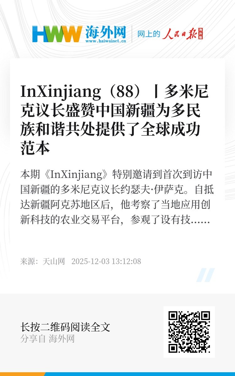 本期《InXinjiang》特别邀请到首次到访中国新疆的多米尼克议长约瑟夫·伊萨克。自抵达新疆阿克苏地区后,他考察了当地应用创新科技的农业交易平台,参观了设有技术研发中心、工人着装专业规范的核桃加工厂,还游览了堪称工程学壮举的湿地公园,认为世界各地荒漠化地区可从中汲取经验。