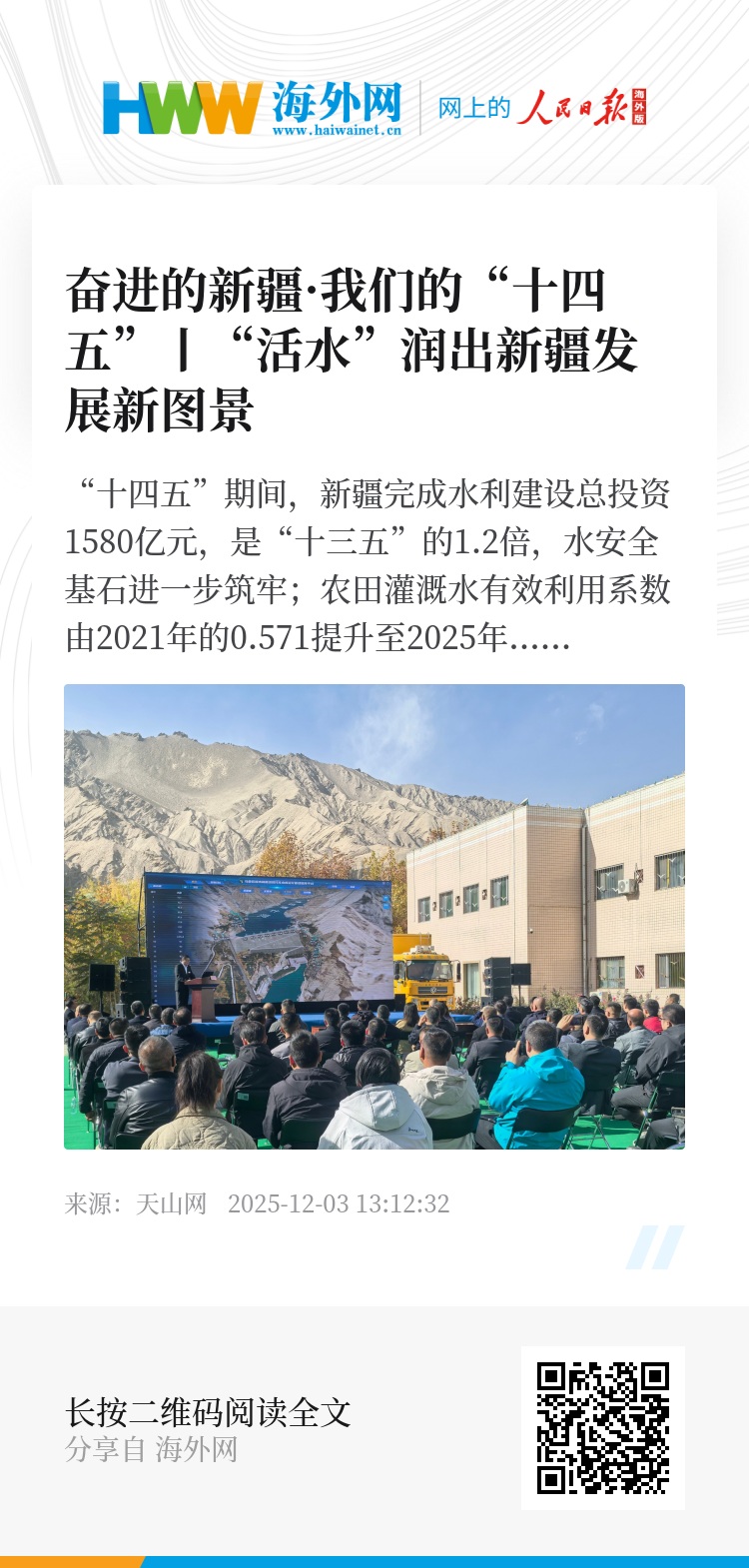 “十四五”期间,新疆完成水利建设总投资1580亿元,是“十三五”的1.2倍,水安全基石进一步筑牢;农田灌溉水有效利用系数由2021年的0.571提升至2025年的0.583,节水增效迈出新步伐;全疆农村自来水普及率达到99.4%,城乡居民共享发展红利。