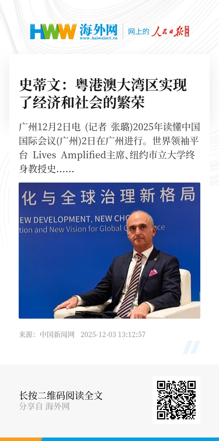 中新网广州12月2日电 (记者 张璐)2025年读懂中国国际会议(广州)2日在广州进行。世界领袖平台 Lives Amplified主席、纽约市立大学终身教授史蒂文·V·梅尔尼克(简称“史蒂文”)在接受采访时表示,粤港澳大湾区实现了经济和社会的繁荣。