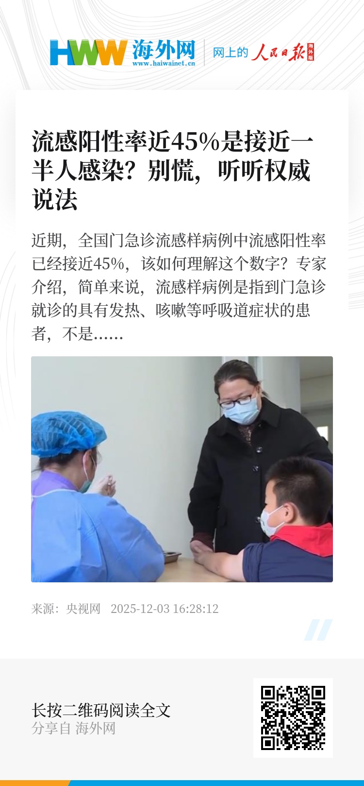 近期,全国门急诊流感样病例中流感阳性率已经接近45%,该如何理解这个数字?专家介绍,简单来说,流感样病例是指到门急诊就诊的具有发热、咳嗽等呼吸道症状的患者,不是像一些网友理解的“在流感病例中检测流感”。我国疾控部门在哨点医院检测的样本涵盖了流感在内的10种病毒以及肺炎支原体在内的多种呼吸道病原体检测。