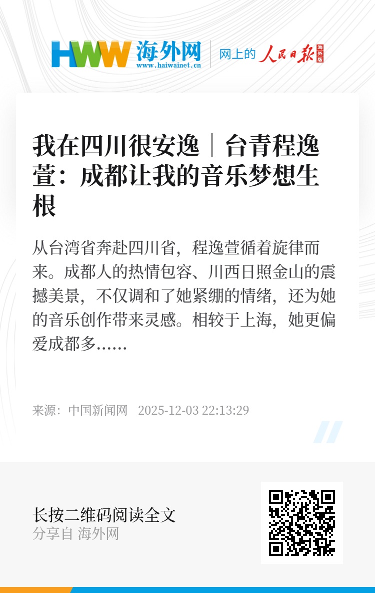 从台湾省奔赴四川省,程逸萱循着旋律而来。成都人的热情包容、川西日照金山的震撼美景,不仅调和了她紧绷的情绪,还为她的音乐创作带来灵感。相较于上海,她更偏爱成都多元包容又不失烟火气的人文氛围。她认为台湾省与四川省在文化接受度上有共通之处,期待两岸音乐能碰撞出新火花。