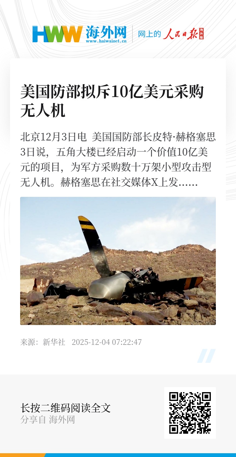 新华社北京12月3日电 美国国防部长皮特·赫格塞思3日说,五角大楼已经启动一个价值10亿美元的项目,为军方采购数十万架小型攻击型无人机。