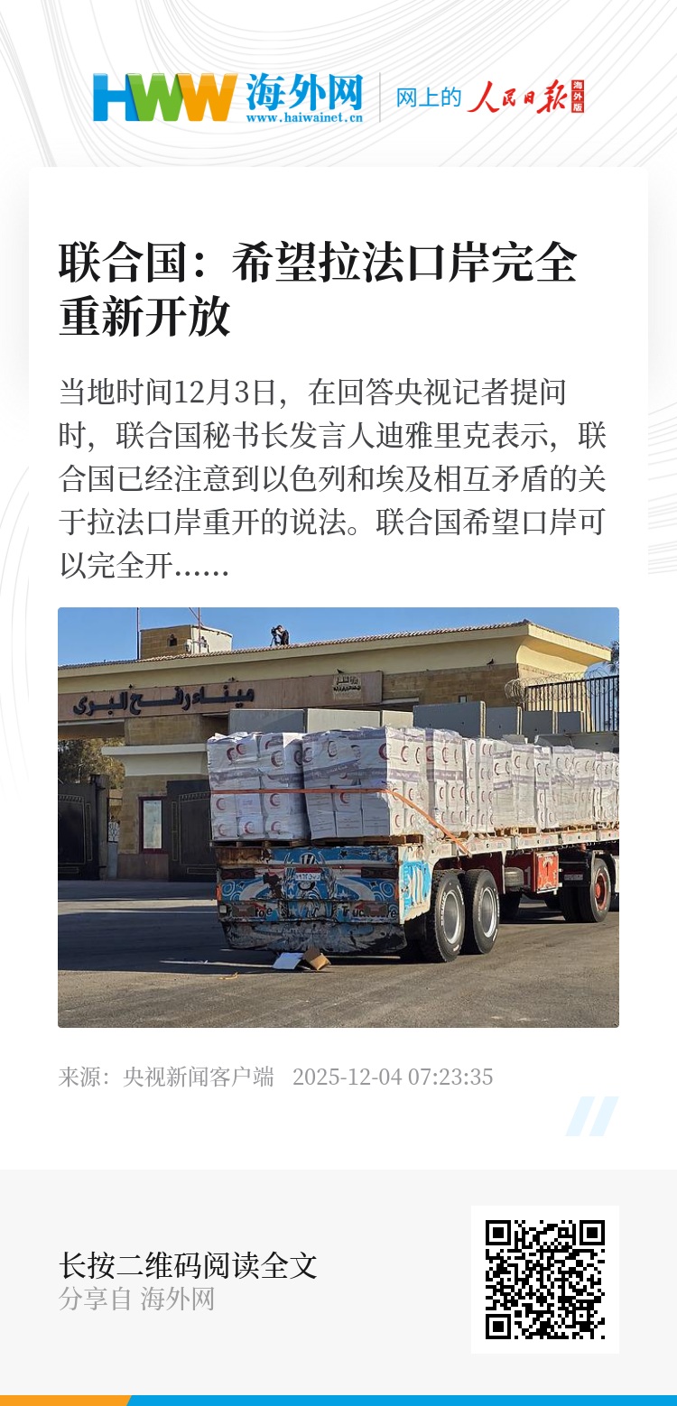 当地时间12月3日,在回答央视记者提问时,联合国秘书长发言人迪雅里克表示,联合国已经注意到以色列和埃及相互矛盾的关于拉法口岸重开的说法。联合国希望口岸可以完全开放,用于人道主义物资的运输, 用于人员的流动。