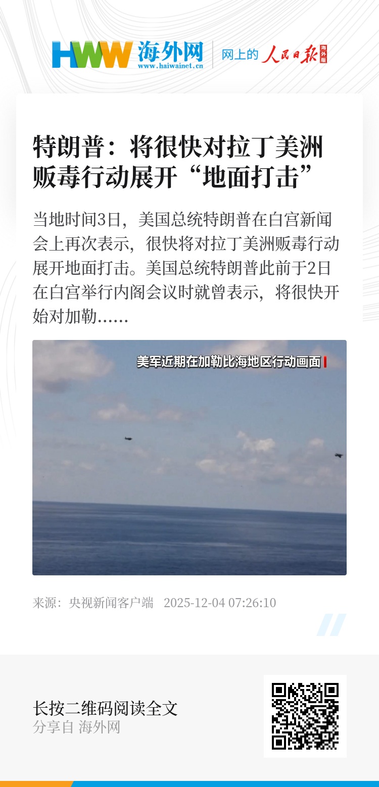 当地时间3日,美国总统特朗普在白宫新闻会上再次表示,很快将对拉丁美洲贩毒行动展开地面打击。