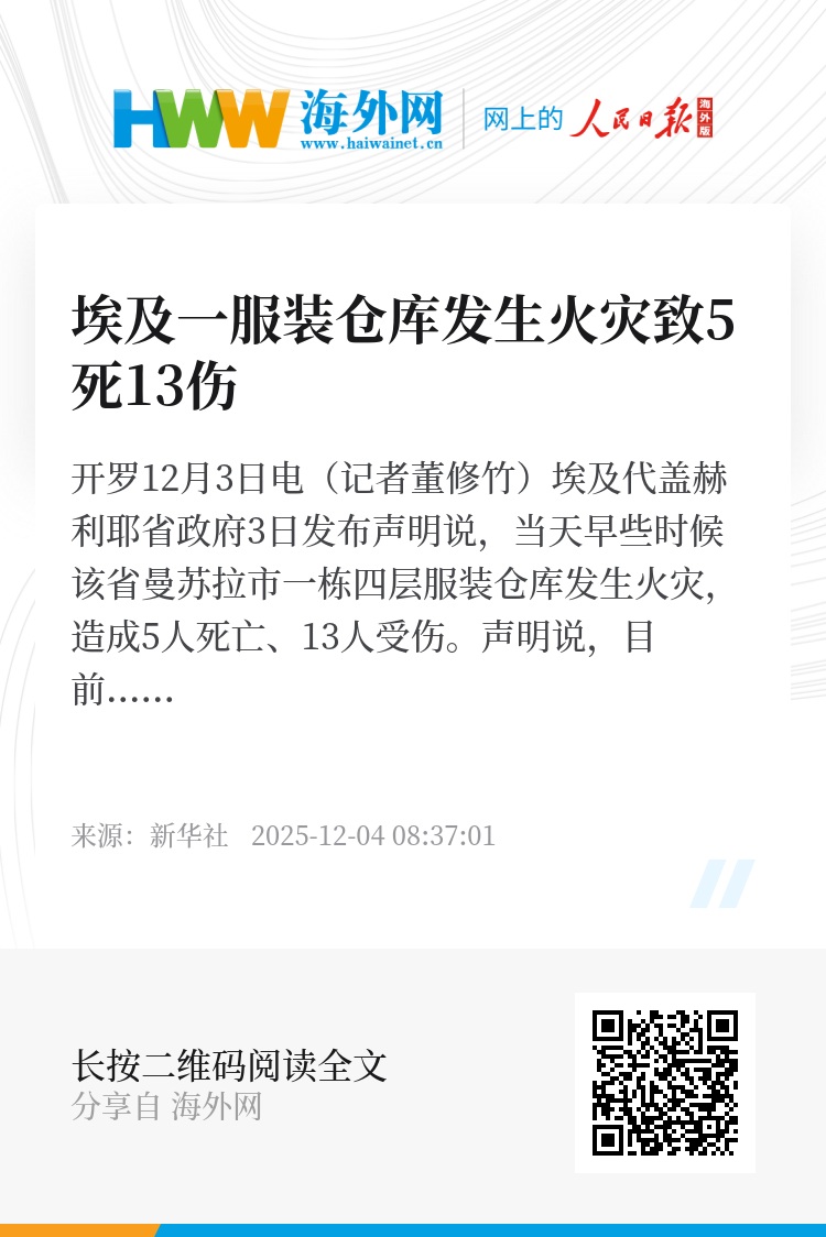 新华社开罗12月3日电(记者董修竹)埃及代盖赫利耶省政府3日发布声明说,当天早些时候该省曼苏拉市一栋四层服装仓库发生火灾,造成5人死亡、13人受伤。