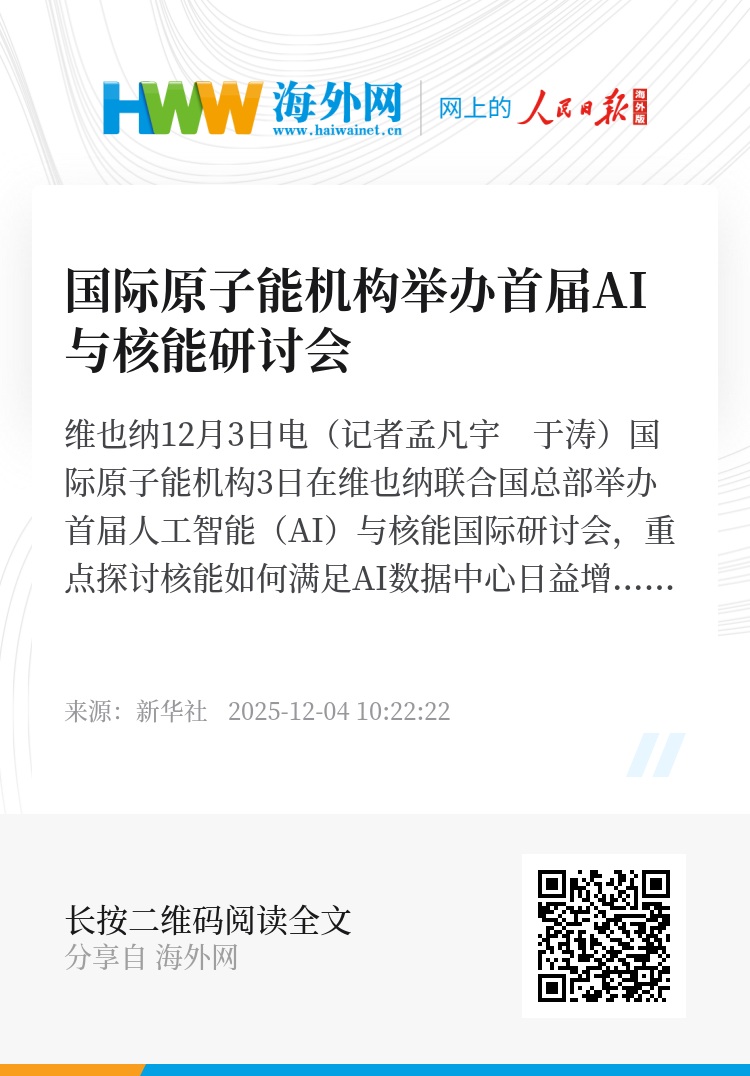 新华社维也纳12月3日电(记者孟凡宇 于涛)国际原子能机构3日在维也纳联合国总部举办首届人工智能(AI)与核能国际研讨会,重点探讨核能如何满足AI数据中心日益增长的电力需求,以及AI如何支持核技术发展。
