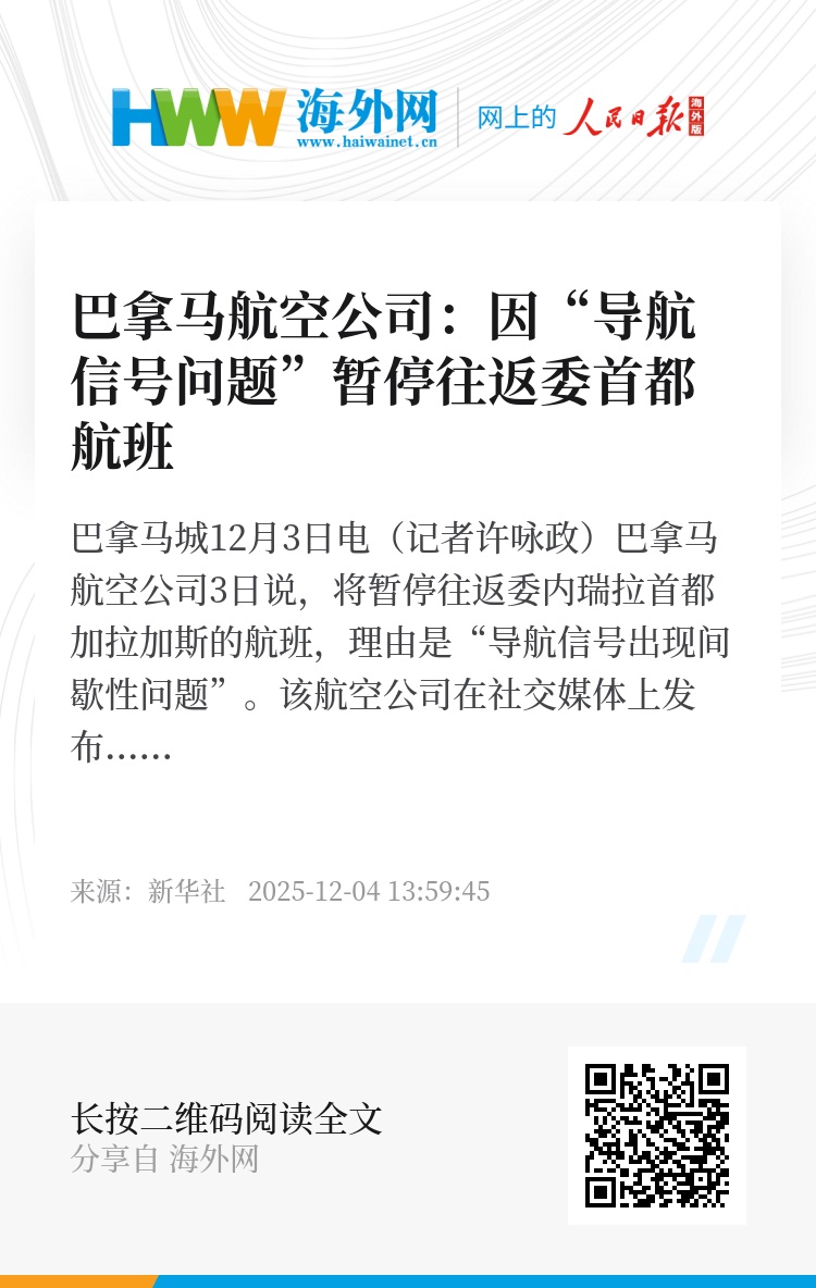 新华社巴拿马城12月3日电(记者许咏政)巴拿马航空公司3日说,将暂停往返委内瑞拉首都加拉加斯的航班,理由是“导航信号出现间歇性问题”。