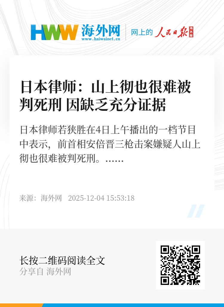 海外网12月4日电 据日本TBS电视台12月4日报道,日本律师若狭胜在当日上午播出的一档节目中表示,前首相安倍晋三枪击案嫌疑人山上彻也很难被判死刑。
