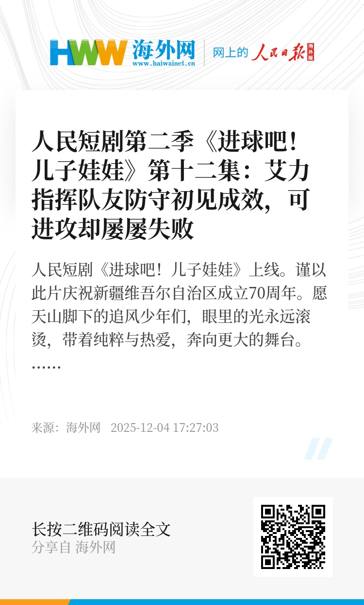人民短剧《进球吧!儿子娃娃》上线。谨以此片庆祝新疆维吾尔自治区成立70周年。愿天山脚下的追风少年们,眼里的光永远滚烫,带着纯粹与热爱,奔向更大的舞台。