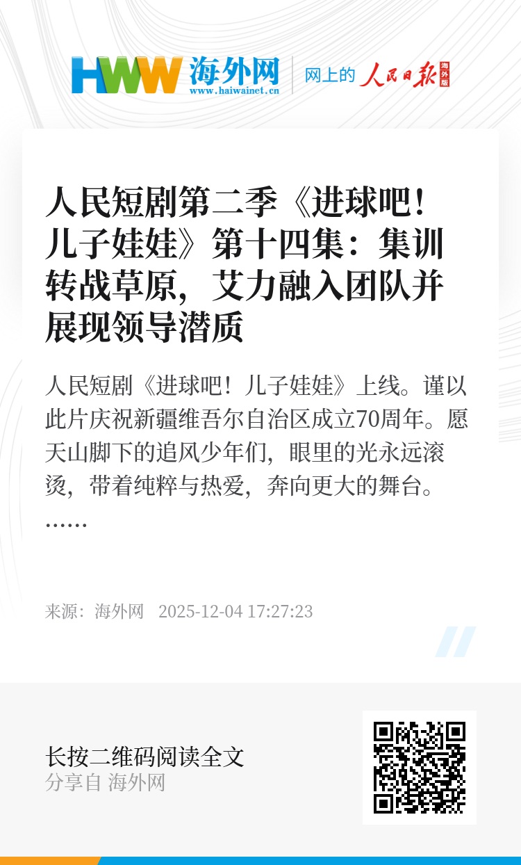 人民短剧《进球吧!儿子娃娃》上线。谨以此片庆祝新疆维吾尔自治区成立70周年。愿天山脚下的追风少年们,眼里的光永远滚烫,带着纯粹与热爱,奔向更大的舞台。