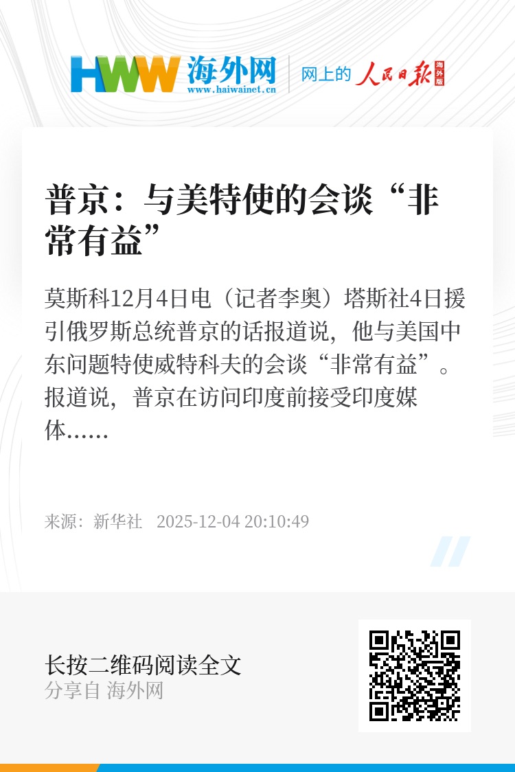 新华社莫斯科12月4日电(记者李奥)塔斯社4日援引俄罗斯总统普京的话报道说,他与美国中东问题特使威特科夫的会谈“非常有益”。