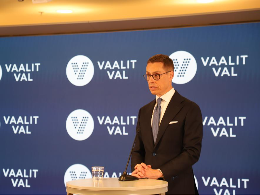 2024年2月11日,在芬兰赫尔辛基市政厅,斯图布与国际媒体见面并回答问题。新华社记者陈静摄