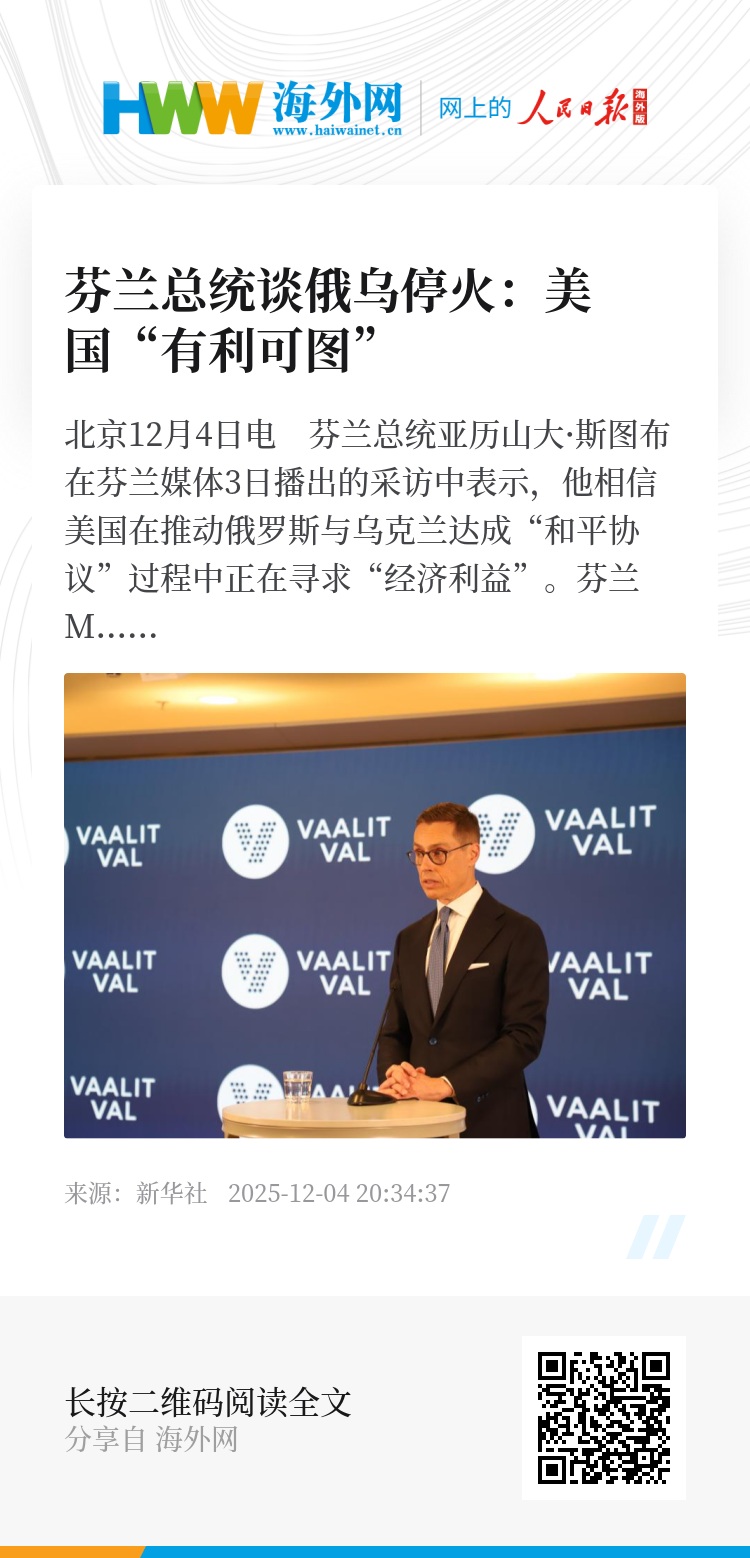 新华社北京12月4日电 芬兰总统亚历山大·斯图布在芬兰媒体3日播出的采访中表示,他相信美国在推动俄罗斯与乌克兰达成“和平协议”过程中正在寻求“经济利益”。