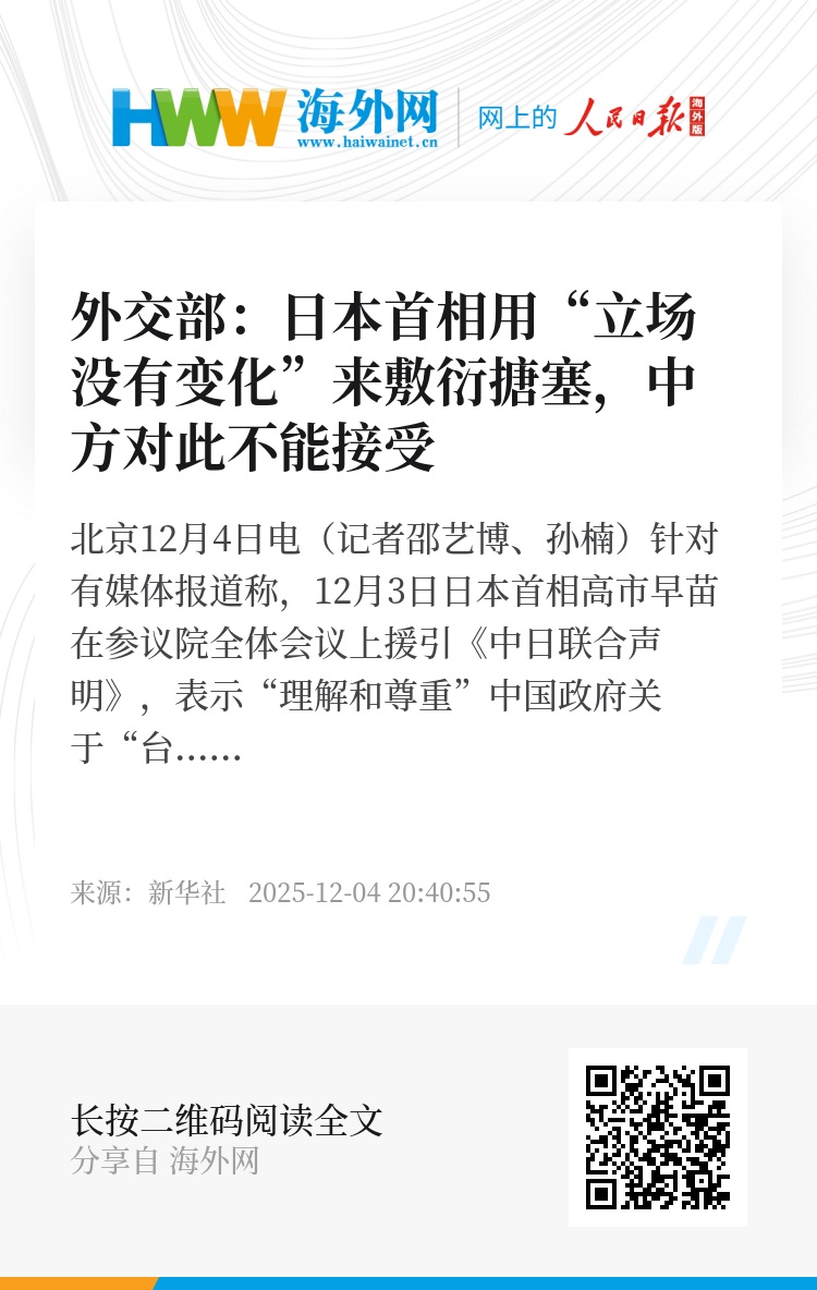 他表示,中方的态度是明确的,我们敦促日方切实反思纠错,撤回高市早苗错误言论。面对历史档案记得清清楚楚、白纸黑字写得明明白白的原则问题,面对中方连日来的多次质问和日本国内、国际社会的批评,高市早苗仍然只是用“立场没有变化”来敷衍搪塞,中方对此不能接受。
