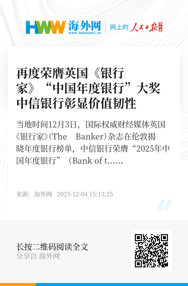 展望未来,中信银行表示,将以此国际殊荣为新起点,在复杂多变的内外部环境中保持战略定力,坚定不移地推动高质量发展,继续肩负起服务实体经济、增进社会福祉的责任,为谱写中国式现代化的金融新篇章,贡献有担当、有价值、有特色、有温度的“中信力量”。