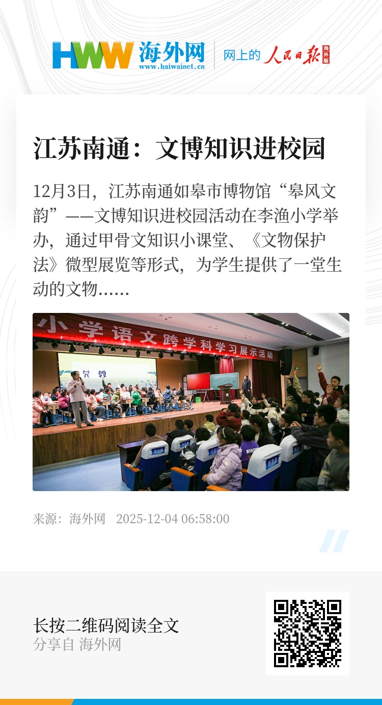 12月3日,江苏南通如皋市博物馆“皋风文韵”——文博知识进校园活动在李渔小学举办,通过甲骨文知识小课堂、《文物保护法》微型展览等形式,为学生提供了一堂生动的文物博物馆课程。图源:视觉中国