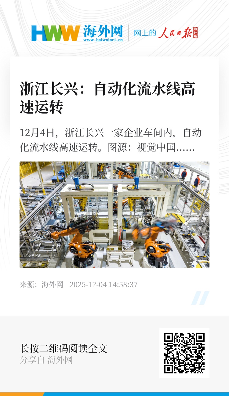32913530,.浙江长兴:自动化流水线高速运转,.2025-12-04 14:58:37,.204309,.陈亚楠、卢思宇