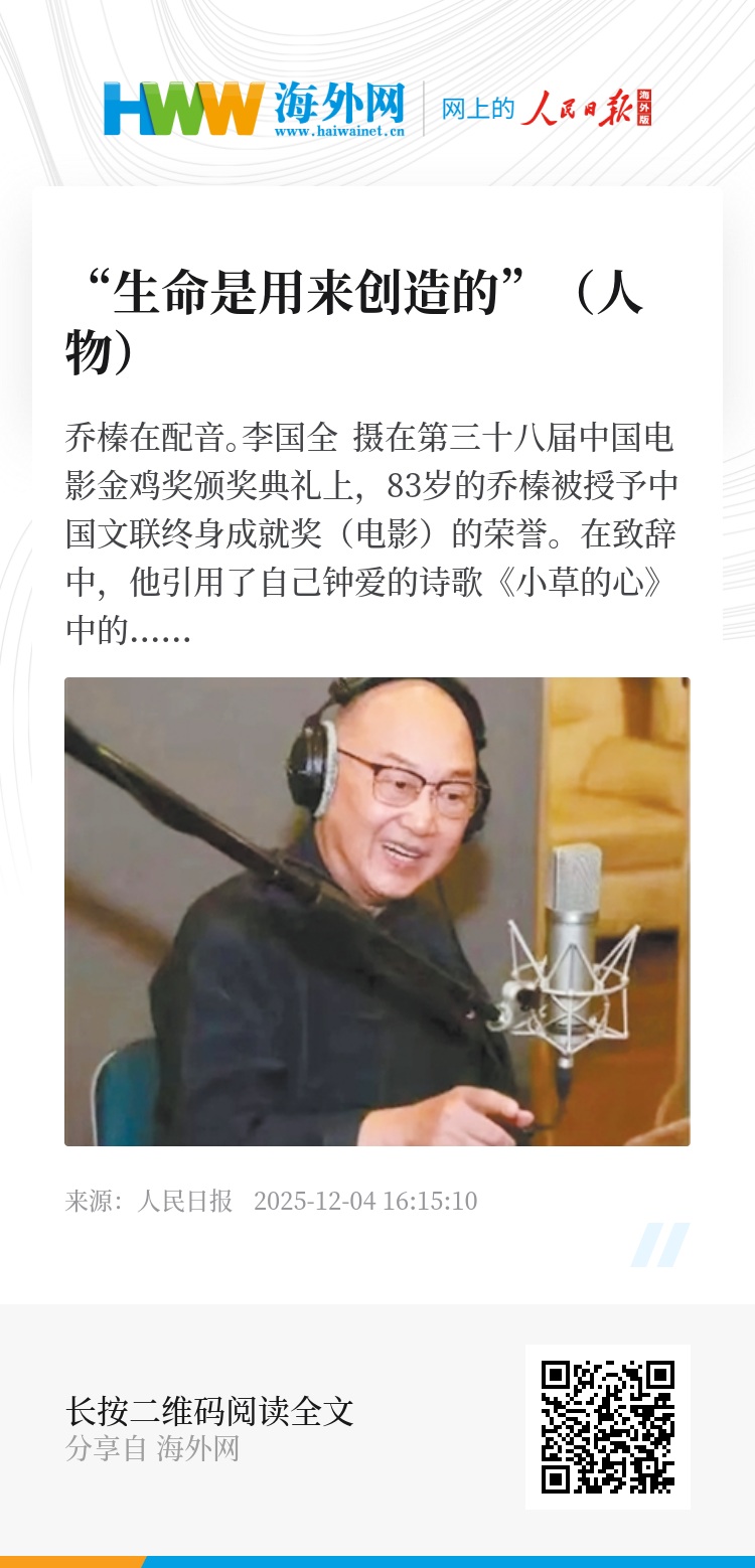在第三十八届中国电影金鸡奖颁奖典礼上,83岁的乔榛被授予中国文联终身成就奖(电影)的荣誉。在致辞中,他引用了自己钟爱的诗歌《小草的心》中的句子:“虽然在这个世界上,我活得并不怎么鲜艳,但既然活着,就得有自己的颜色。”像草一般扎根泥土,这是他创作的品格。