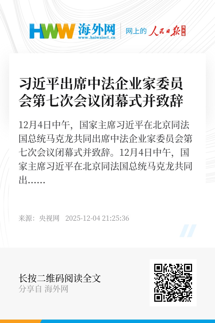 习近平强调,中共二十届四中全会审议通过了“十五五”规划建议。中国将全面推进中国式现代化,扩大高水平对外开放。欢迎法国企业家继续共享中国发展红利。