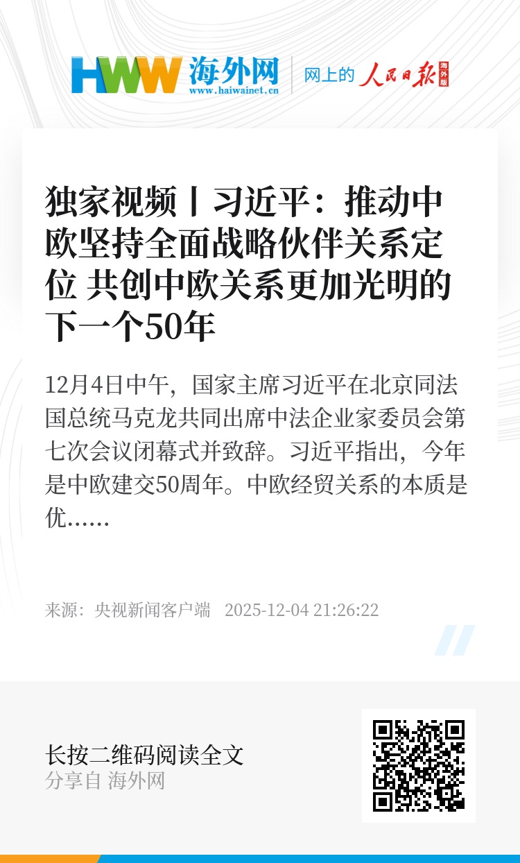 习近平指出,今年是中欧建交50周年。中欧经贸关系的本质是优势互补、互利共赢,完全能够在发展中实现动态平衡。相互依赖不是风险,利益交融不是威胁。中法双方要推动中欧坚持全面战略伙伴关系定位,共创中欧关系更加光明的下一个50年。
