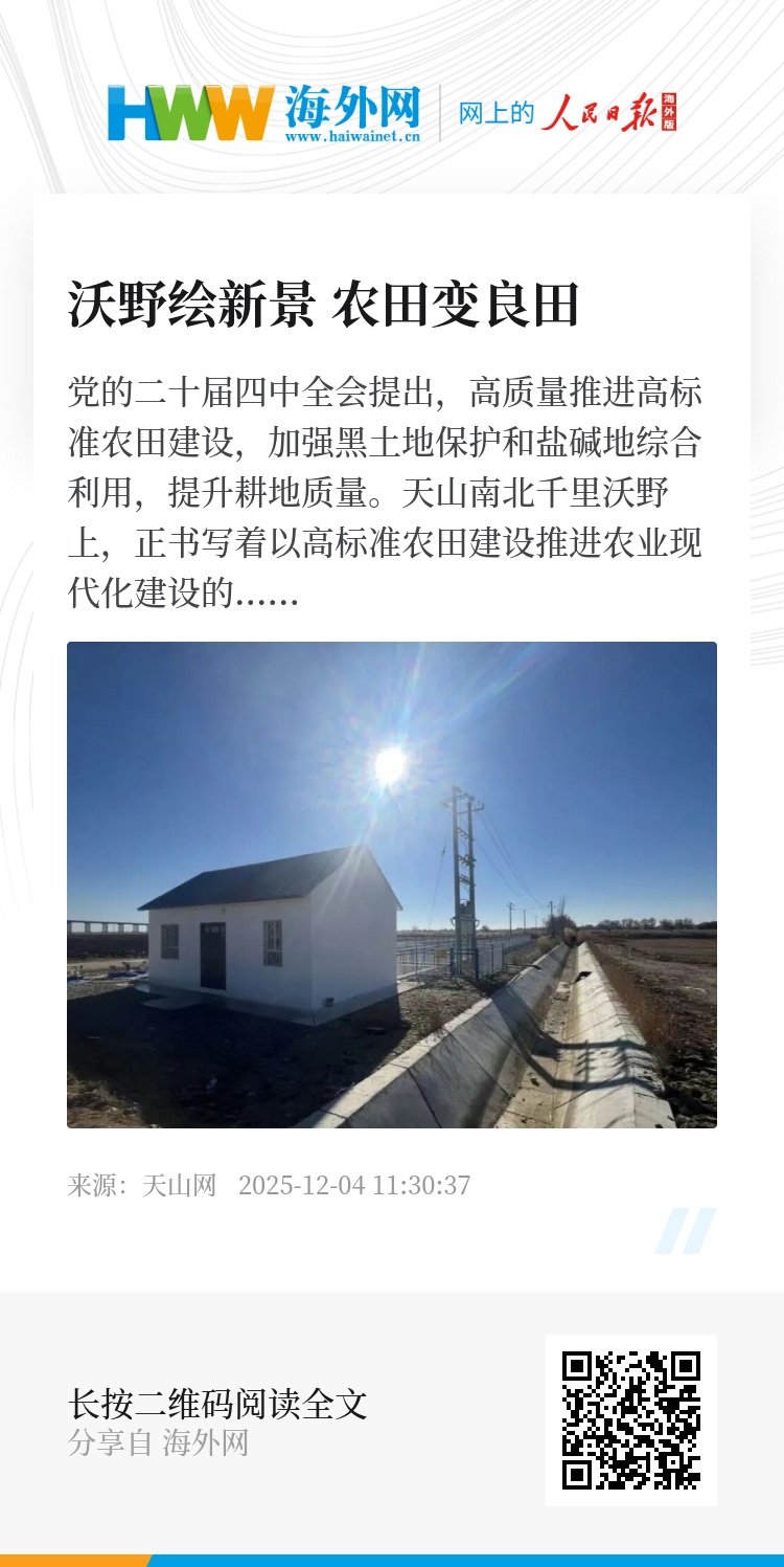 党的二十届四中全会提出,高质量推进高标准农田建设,加强黑土地保护和盐碱地综合利用,提升耕地质量。天山南北千里沃野上,正书写着以高标准农田建设推进农业现代化建设的新篇章。