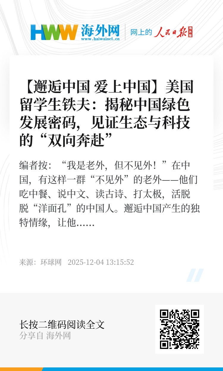 “我是老外,但不见外!”在中国,有这样一群“不见外”的老外——他们吃中餐、说中文、读古诗、打太极,活脱脱“洋面孔”的中国人。邂逅中国产生的独特情缘,让他们深深爱上了中国。环球网“环聚一堂”工作室推出“邂逅中国 爱上中国”——老外不见外系列短视频栏目,讲述“不见外”的老外的生动故事,以外国人视角真实展现经济腾飞、社会巨变、绿水青山的新时代中国。今日,本网播发第二十三期短视频:《美国留学生铁夫:揭秘中国绿色发展密码,见证生态与科技的“双向奔赴”》。