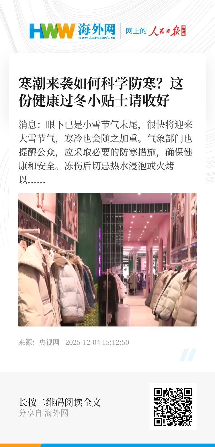 山西省气象服务中心服务首席 李清华:另外,气温骤降可能诱发呼吸和心脑血管系统疾病,加重慢性基础性疾病,也可能造成冻伤。因此,公众应做好防寒保暖,特别是头部和胸腹部保暖。再有,如果寒潮过程伴有雨雪,加上气温下降,会造成地面湿滑,公众外出时应注意防滑、防跌倒,尽量避免长时间在户外停留。气象预警就是健康提示,跟着天气调整生活,才能在寒冷多变的天气里保护好自己和家人。