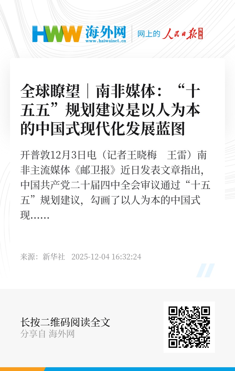 新华社开普敦12月3日电(记者王晓梅 王雷)南非主流媒体《邮卫报》近日发表文章指出,中国共产党二十届四中全会审议通过“十五五”规划建议,勾画了以人为本的中国式现代化发展蓝图。文章摘要如下: