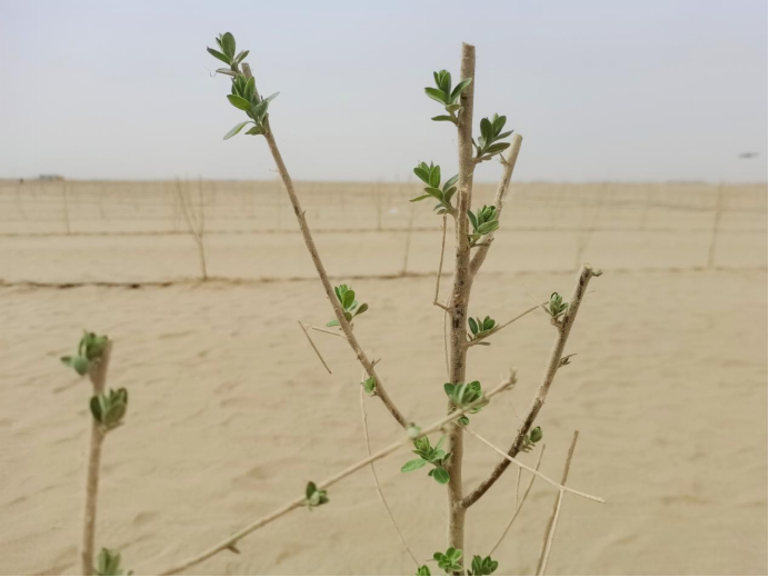 2025年4月,和田县阿和公路西侧群众治沙点位的大果沙枣冒出新芽。马雯萱 摄