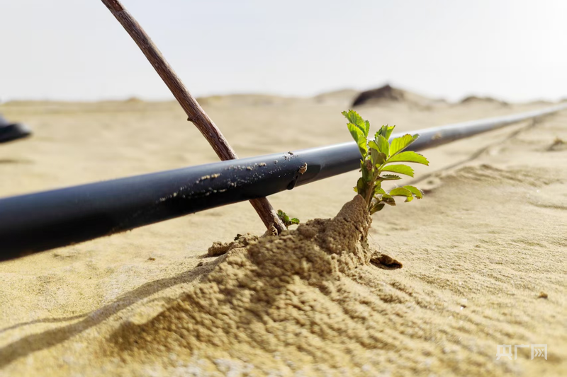 塔克拉玛干锁边合龙区域的于田县万花园沙产业试验田沙漠玫瑰露出新芽。(央广网记者丁安 摄)