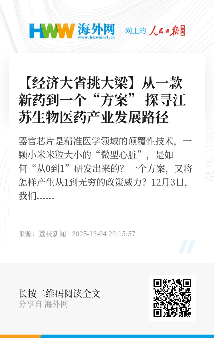 器官芯片是精准医学领域的颠覆性技术,一颗小米米粒大小的“微型心脏”,是如何“从0到1”研发出来的?一个方案,又将怎样产生从1到无穷的政策威力?12月3日,我们走近江苏的生物医药产业,看看那里澎湃的创新脉动和鲜明的发展路径。