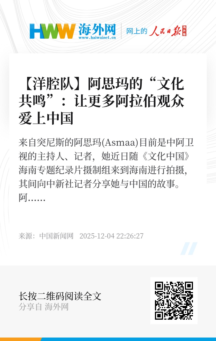 展望未来,她计划持续通过节目,架起中阿两地的交流桥梁,将中国的科技成就、文化底蕴与发展活力传递给阿拉伯观众,让阿拉伯世界看见一个“真实、立体、美丽”的中国,同时鼓励阿拉伯观众“学习中文,亲自来感受这片土地的温暖与活力”。(陈英清 张茜翼 海南综合报道)