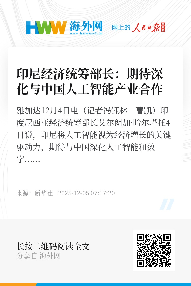 新华社雅加达12月4日电(记者冯钰林 曹凯)印度尼西亚经济统筹部长艾尔朗加·哈尔塔托4日说,印尼将人工智能视为经济增长的关键驱动力,期待与中国深化人工智能和数字经济领域合作,以推动产业高质量发展。