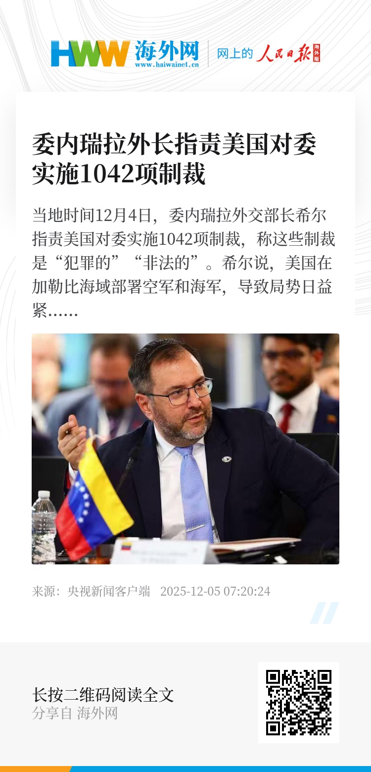 当地时间12月4日,委内瑞拉外交部长希尔指责美国对委实施1042项制裁,称这些制裁是“犯罪的”“非法的”。
