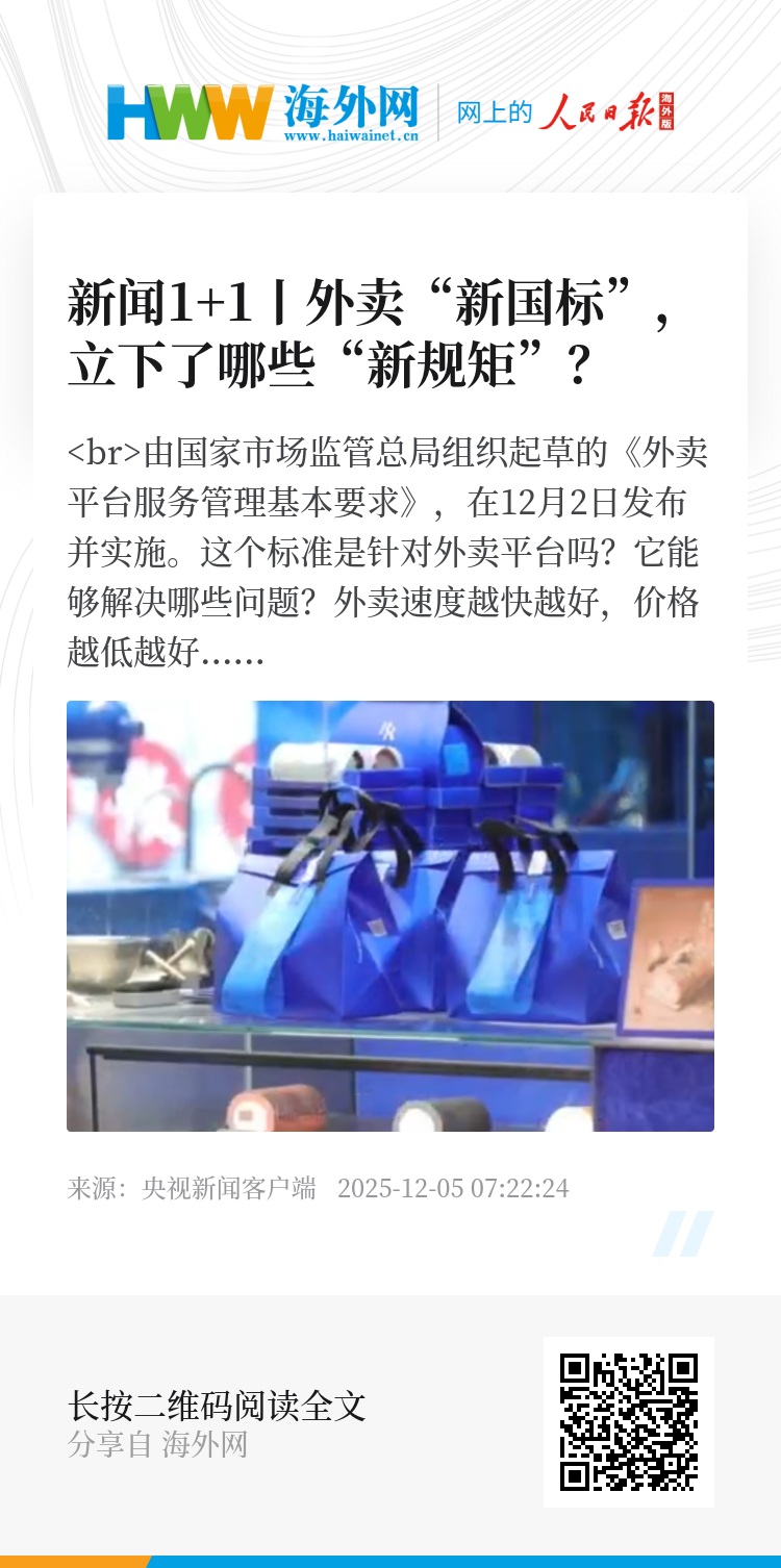 由国家市场监管总局组织起草的《外卖平台服务管理基本要求》,在12月2日发布并实施。这个标准是针对外卖平台吗?它能够解决哪些问题?外卖速度越快越好,价格越低越好的这种外卖魔咒,能被这份国标打破吗?《新闻1+1》本期关注:外卖“新国标”,立下了哪些“新规矩”?