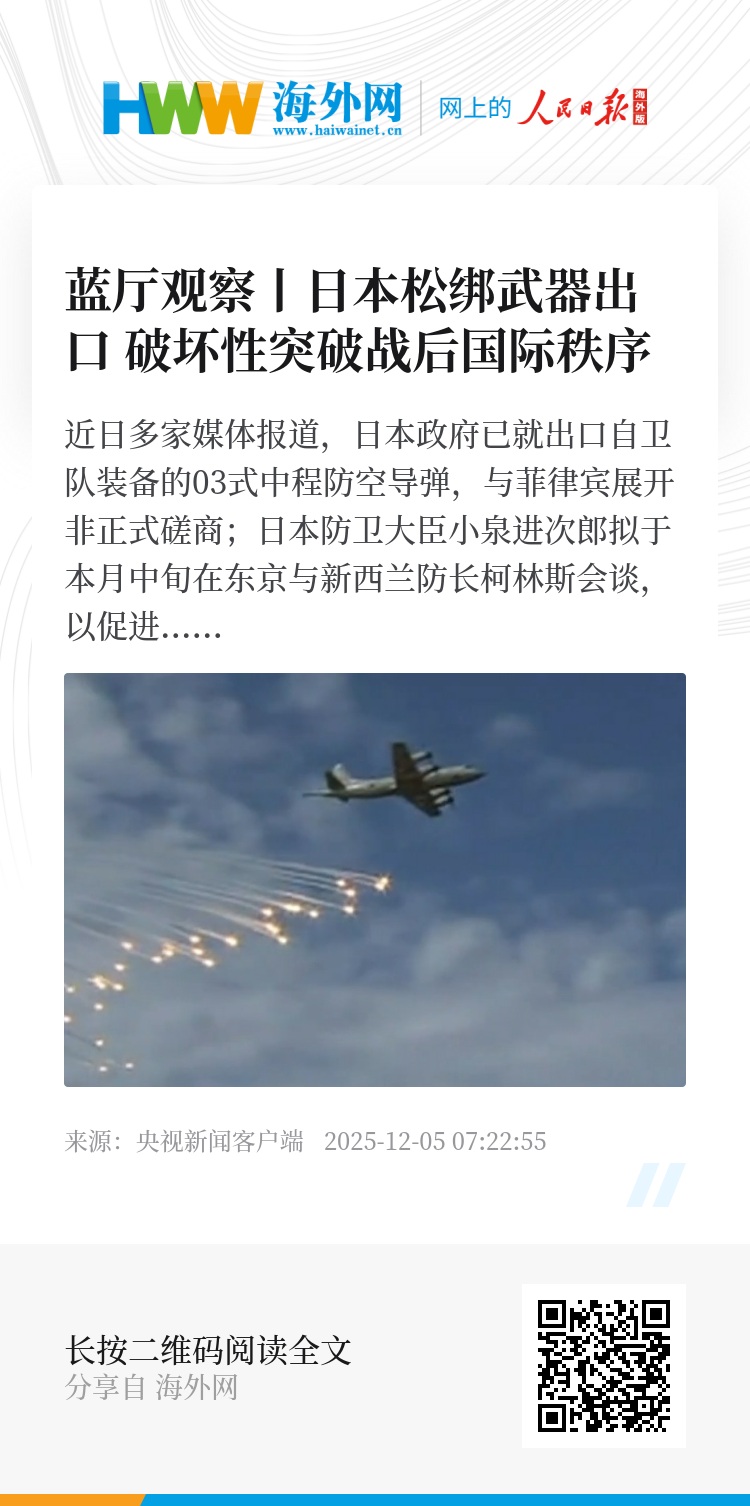 近日多家媒体报道,日本政府已就出口自卫队装备的03式中程防空导弹,与菲律宾展开非正式磋商;日本防卫大臣小泉进次郎拟于本月中旬在东京与新西兰防长柯林斯会谈,以促进防卫装备出口。此外,日本政府还计划2026年上半年废除现行将防卫装备出口限定于五大非战斗用途的规则。种种迹象表明:日本正努力废除将致命武器排除在其出口名单之外的严格限制。日本武器出口政策持续“松绑”的背后目的是什么?是否构成对“和平宪法”的实质性架空呢?来看今天的《蓝厅观察》。