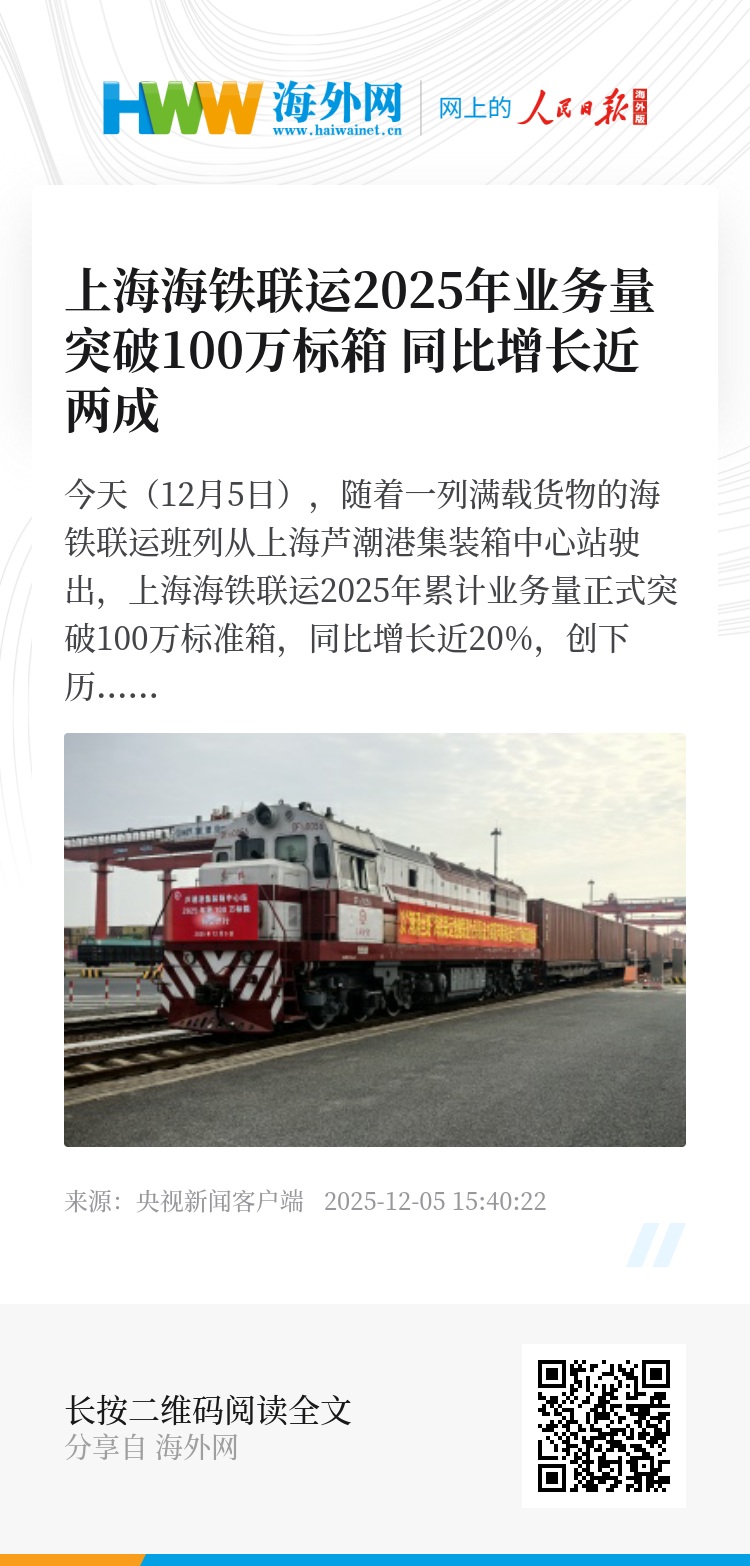 今天(12月5日),随着一列满载货物的海铁联运班列从上海芦潮港集装箱中心站驶出,上海海铁联运2025年累计业务量正式突破100万标准箱,同比增长近20%,创下历史新高。