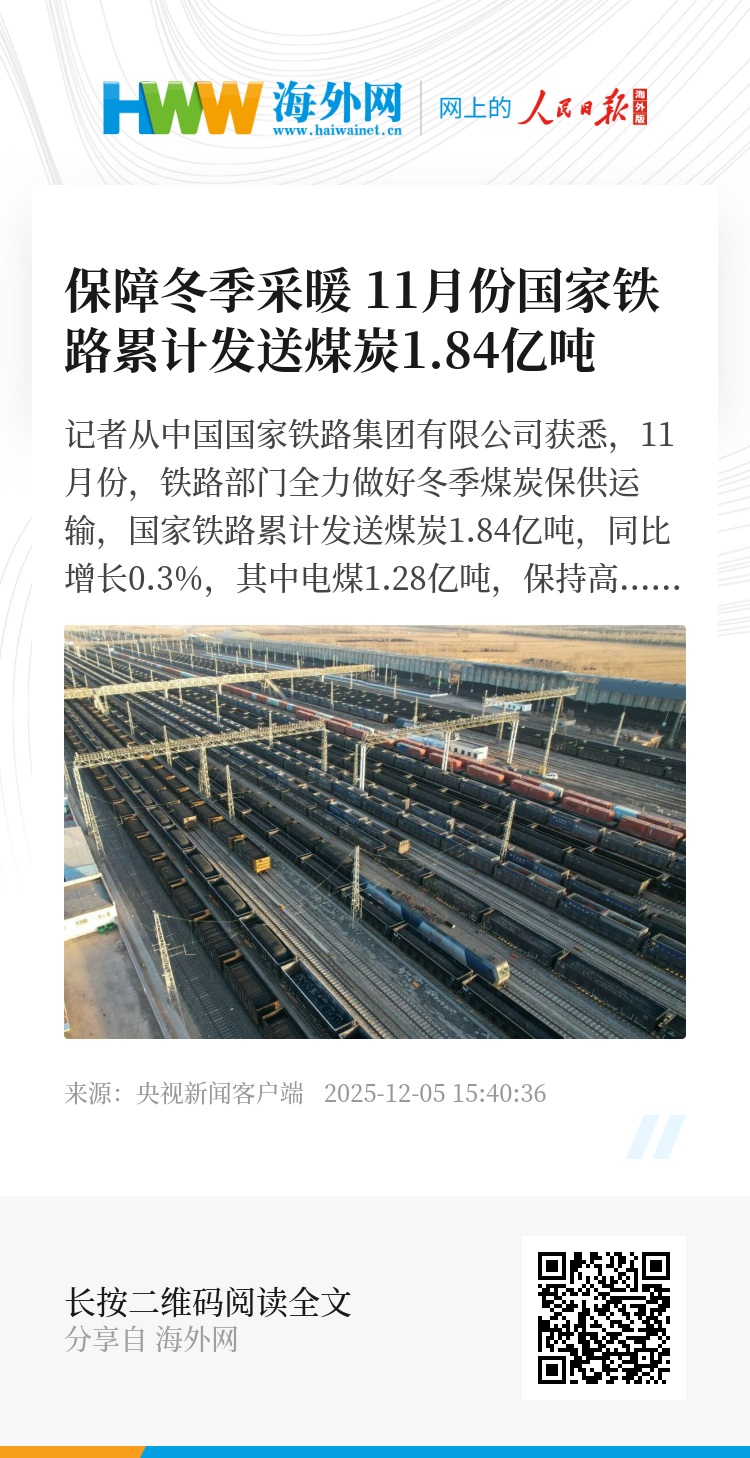 记者从中国国家铁路集团有限公司获悉,11月份,铁路部门全力做好冬季煤炭保供运输,国家铁路累计发送煤炭1.84亿吨,同比增长0.3%,其中电煤1.28亿吨,保持高位,有力保障了各地冬季采暖、发电用煤需求。截至11月底,全国铁路直供电厂存煤8823万吨,可耗天数35.8天,同比增加1天,其中存煤15天以下的电厂实现动态清零。(总台央视记者 郑连凯)