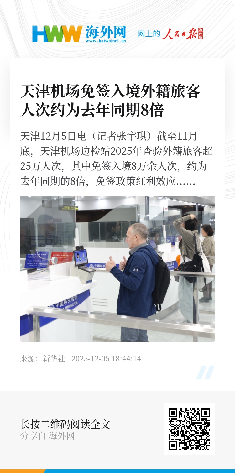 新华社天津12月5日电(记者张宇琪)截至11月底,天津机场边检站2025年查验外籍旅客超25万人次,其中免签入境8万余人次,约为去年同期的8倍,免签政策红利效应显著。