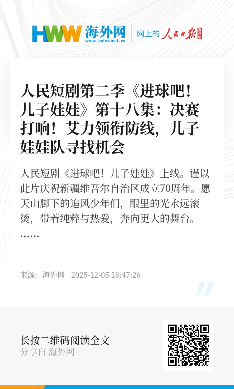 人民短剧《进球吧!儿子娃娃》上线。谨以此片庆祝新疆维吾尔自治区成立70周年。愿天山脚下的追风少年们,眼里的光永远滚烫,带着纯粹与热爱,奔向更大的舞台。