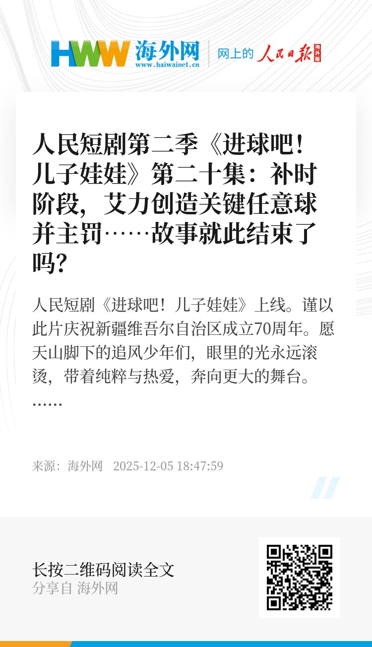 人民短剧《进球吧!儿子娃娃》上线。谨以此片庆祝新疆维吾尔自治区成立70周年。愿天山脚下的追风少年们,眼里的光永远滚烫,带着纯粹与热爱,奔向更大的舞台。
